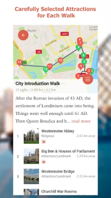 This handy application presents you several self-guided city walks, featuring the main attractions of the city. It comes with detailed walk route maps and powerful navigation features. No need to hop on a tour bus or join a tour group; now you can explore all the city attractions on your own, at your own pace, and at a cost that is only a fraction of what you would normally pay for a guided tour.