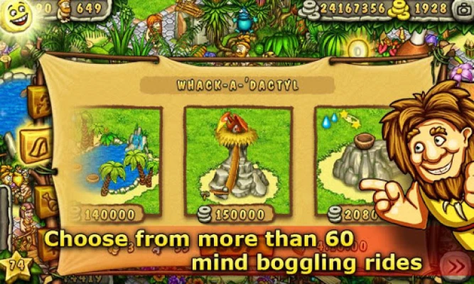 ★ You can choose from more than 60 mind boggling attractions and rides: giant wooden swings, trampolines made from mammoth hide, giddy merry-go-rounds, stone slides, extreme roller coasters, water rapids and even dinomotors powered by real huge Jurassic dinosaurs to make all these rides run!